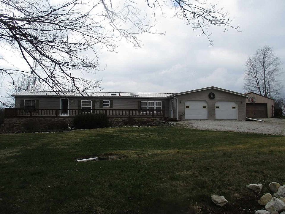 Very nice manufactured home with 3 bedrooms, 2 full baths, large kitchen with bar, gas heat, central air, 10x50 front deck, 10x22 back deck, 2 1/2 car attached garage, plus a 2 car detached garage, located on 4.75 acres close to Crane NSWC.