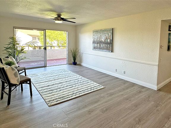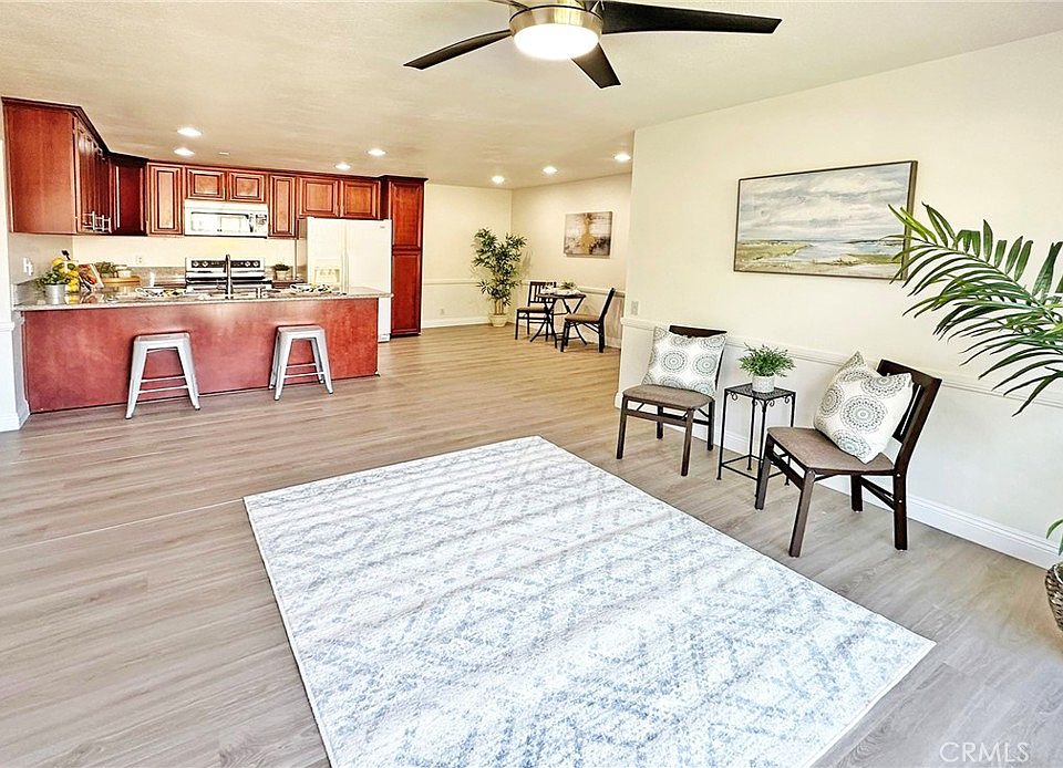 Beautiful Sun-Drenched Upper Condo in the Highly Desired Bench Mark Villas Community Boasts 2 Bedrooms, 1 Upgraded Bathroom, Inside Laundry Closet, and a Large Balcony with Gorgeous Views - Overlooking Lush Grounds, Park, and Playground. The Open Concept Design Features Wood Laminate Flooring Throughout, Ceiling Fans, Chair Railing, High Baseboards, and a Beautifully Remodeled Kitchen that Includes Granite Countertops, a Breakfast Bar, Recessed LED Lighting, Stainless Appliances (Brand New Electric Range, Dishwasher, and Microwave), Stainless Sinks, and Cherry Cabinetry. The Kitchen is Open to a Charming Dining Area and the Spacious Living Room, Providing the Perfect Space for Entertaining or Relaxing. The Bathroom has been Remodeled and Showcases Tile Flooring, Tile Wainscoting, Newer Vanity, Newer Light Fixture, Newer Walk-In Shower Surround with Glass Enclosure, Plus Added Decor Shelving. Step out onto the Large Balcony, Accessible from Sliding Glass Doors in both the Living Room and the Second Bedroom, and enjoy your Morning Coffee or Evening Sunsets. There is a Large Walk-In Storage Closet Accessible from Balcony. The Roomy Bedrooms offer Ample Closet Space, Ensuring you have Plenty of Storage for all Your Belongings. Bench Mark Villas are FHA and VA Approved, have Low Association Dues that Covers Water and Trash. This Unit Includes 2 Floating Parking Spaces and Plenty of Guest Parking. It is Next to Rimgate Park which Offers Various Sports Courts, 3 Playgrounds, Soccer Field, and Several Barbecues and Picnic Tables. It is Close to High-End Shopping, Popular Restaurants, 15 Minute Drive to Laguna Beach, and Located within a Top-Rated School District! This community is FHA and VA approved!