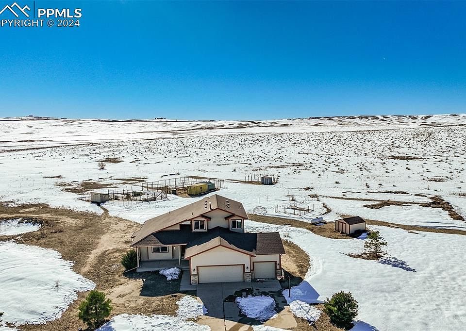 Enjoy the Country Living on this nice 1.5 Story 4 Bed/3 Bath/3 Car Garage Custom 'Walk-Out Lower Level' Home on a gorgeous 40 acre fenced lot!! NO COVENANTS or HOA!! Home boasts an open floor plan on Main Level with Large Liv Rm w/ Vaulted Ceilings and Gas Fireplace, flowing into the Kitchen/Dining Rm. Combination with Walk-Out to NEW Back Deck w/Stairs with a wonderful 'Walk-In' Pantry(Also is plumbed for a 1/2 Bath)!!! MAIN LEVEL MASTER Bedroom w/Adjoining Bath and Walk-In Closet!! Main Level Laundry!!! Upper Level has 2 Spacious Bedrooms and a 'Loft Area' overlooking the Living Room and Kitchen area. Lower Level has a Large Family Room with Walk-Out to backyard area & 4th Large Bedroom with a Full Bath. The property also consists of a couple Conex Storage Units with current uses of a greenhouse and many other storage buildings and sheds that are fenced in which are PERFECT for all the 4-H and other animals!!! Only 30 Minutes to Colorado Springs in the popular Peyton area!!! Come Enjoy our Country!!! Love to have you as our Neighbors!!