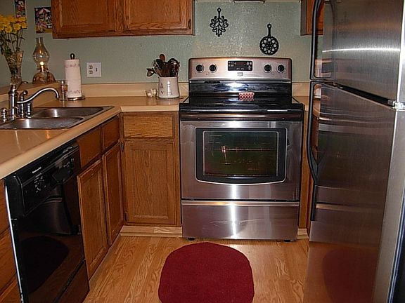 New laminate flooring and paint throughout. New stainless fridge and flat top range oven. Renovated bathroom and new light fixtures in bathroom, smaller bedroom and walk-through closet. New window treatments in both bedrooms!