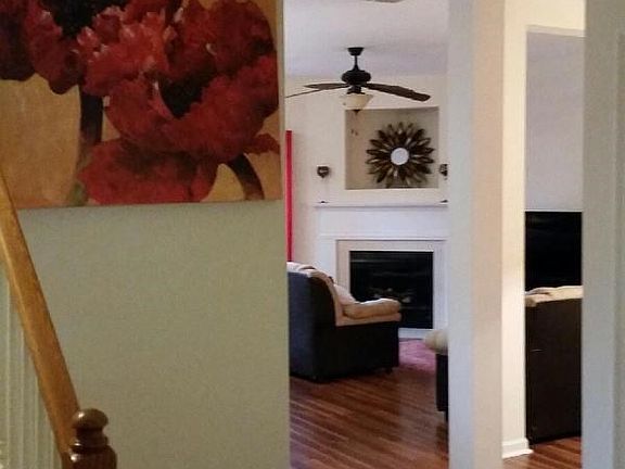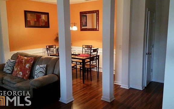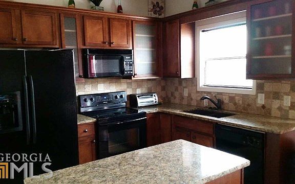 Kitchen with Island, Granite Countertops and Black appliances. view of familly room with fireplace. Well maintained townhome located in Lawrenceville, nice open floorplan, walk in closets, double vanity in master bedroom.