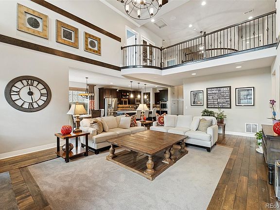 This former Toll Brothers model home is a showstopper from the moment you arrive. Every inch of this residence reflects thoughtful design, timeless craftsmanship, and exceptional upgrades. From the sweeping spiral staircase with oak end caps to the rich solid hardwood floors and custom built-ins, this home is filled with details that elevate everyday living into something truly special. The grand two-story foyer makes a lasting impression, leading into a spacious, open floor plan that flows effortlessly. The heart of the home is the two-story great room, where exposed wood beams and a floor-to-ceiling brick fireplace create warmth and character, all bathed in natural light. The gourmet kitchen is as functional as it is beautiful, with a gas cooktop, double ovens, built-in refrigerator, butler’s pantry, and a large walk-in pantry. Whether hosting a crowd or enjoying a quiet dinner, this space delivers. Just off the kitchen, the study is a standout feature with a custom granite desk and bookcases, perfect for remote work or creative pursuits. The main floor primary suite offers a serene retreat with an inlaid wood ceiling, five-piece bathroom, and a walk-in closet with custom built-ins. Upstairs, you’ll find a versatile loft area ideal for a recreation room. The finished basement expands your options even further with generous room for movie nights, or games, complete with a stylish wet bar that makes entertaining effortless. The backyard is fully landscaped, featuring a built-in gas grill for easy outdoor dining. Thoughtful touches continue with a well-equipped mudroom, laundry room with extra cabinetry, and a spacious 3-car tandem garage. Situated just steps from scenic trails, with sweeping views and access to the beautiful neighborhood pool, clubhouse, and nearby coffee house, this home combines luxury and livability in one perfect package. Located close to downtown Parker and DTC, you’ll enjoy convenience, community, and comfort at an entirely new level.