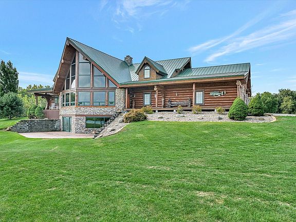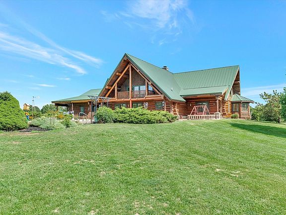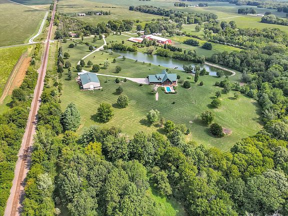 This magnificent hand-crafted log home boasts rustic charm and exudes luxury, sitting on 18 acres PLUS 35 acres in 2 additional parcels of prime hunting ground with over 1/4 mile of Salt Fork River frontage and just 20 minutes from the State Farm Center. With all logs coming from British Columbia, Canada, and the stone imported from the Flathead River in Montana, you will truly feel like you are at a resort. The living spaces extend to more than 6,700 square feet, with 5 bedrooms and 4 bathrooms. The core of this majestic log home is the great room with vaulted ceilings, an impressive double-sided stone fireplace, and floor-to-ceiling windows overlooking the 5-acre lake fully stocked with bass, bluegill, catfish, and crappie. You will also enjoy viewing wildlife from the house daily. The gourmet kitchen is nothing less than a dream with quartz countertops, and stainless steel appliances including a double Viking Professional gas range/oven. The first-floor primary suite boasts a soaring vaulted ceiling, access to the back patio, a fully outfitted walk-in closet, and a luxurious spa-inspired full en-suite bath with a sunken jacuzzi tub, massive walk-in shower with double showerheads and a sprawling double vanity. The splendid wood staircase leads you to the open and sun-soaked family room with spectacular views. The second-floor dedicated office/den area will allow you to complete the necessary work/studies. Your guests will appreciate the second-floor bedroom, full bath, and separate sitting area. Spend your weekends relaxing and entertaining on the sprawling back patio overlooking your own poolside retreat boasting an inground fiberglass pool. The full basement features a fifth bedroom, a full bath, and excellent storage space. While the main open section of the basement is unfinished, this offers endless possibilities for future added living space or a dedicated recreation/game room for indoor play during those cold winter months. Need space to store big toys? How about a 6,000 sqft machine shed that is fully concreted, has water along with a heated and cooled office plus a heated hunting room! The dogs in the family will enjoy the heated & cooled dog kennel and run. Have horses? No problem, there is also a horse barn on the property! Deer hunters will love this land ... all deer in the house & hunting room came from this property! Want more land to hunt? This home is truly a MUST-SEE! Call today to schedule your private showing.
