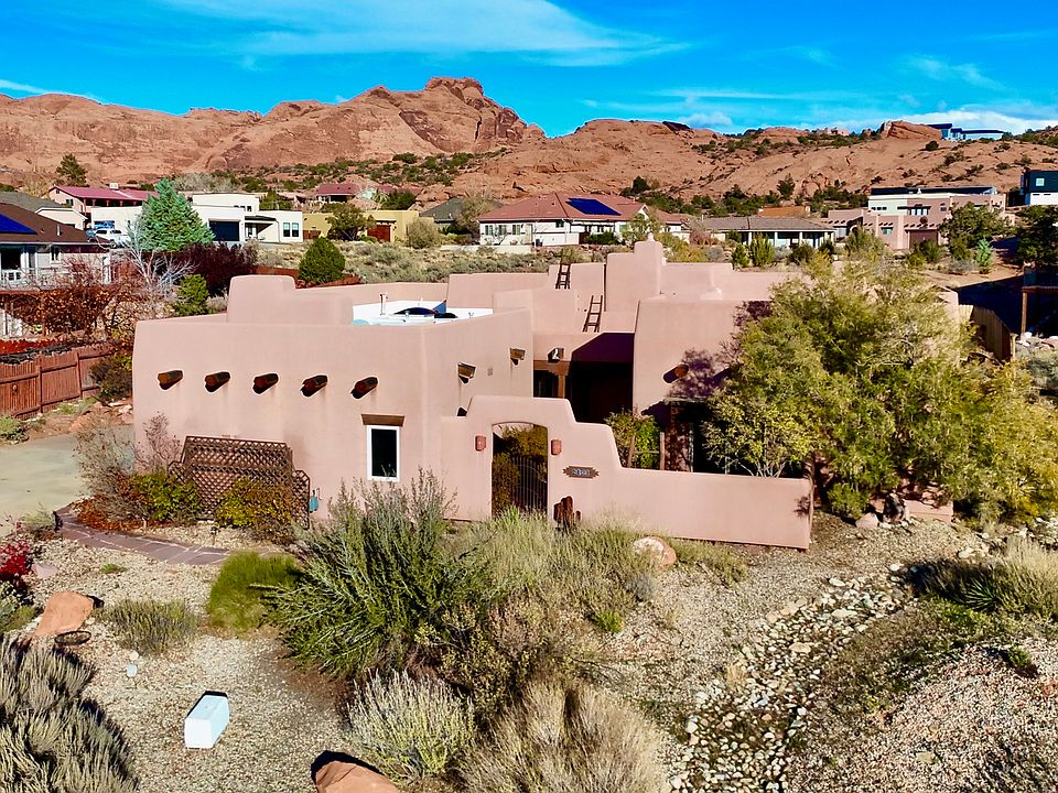 Beautifully crafted adobe-inspired home featuring authentic viga ceilings, warm natural textures, and a classic kiva fireplace. The open living and dining areas flow effortlessly, offering abundant light and inviting Southwestern character. Enjoy a spacious covered patio with flagstone flooring, mature desert landscaping, and serene views of the surrounding cliffs. The walled courtyard provides privacy while maintaining a strong connection to the red rock scenery. Located in a quiet neighborhood close to Moab's outdoor recreation. Home furnishings and dcor are negotiable.