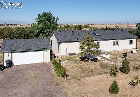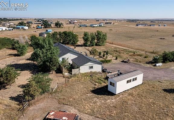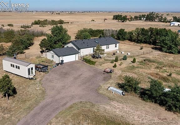 5+ Acre home with 3 bedroom, 2 baths, over 2,000 sqft all in the main level with 2 car detached garage and separate workshop with overhead door! Home has been updated and remodeled with new composite flooring and ceramic tile. New granite counter tops and paint. House shows pride of ownership and includes new Trex deck. About 20 minutes from Colorado Springs and very close to Schirever AFB and Peterson AFB. Horses allowed as well as livestock. Garage is 24x24 and work shop is 20x28 and has concrete floors and electricity. Huge master bedroom with new flooring and closet system. Master bathroom has jetted tub, separate shower and new sinks. Property is fenced and also has fenced in dog run. Culdesac lot has lots of views of the plains and mountain views. Quiet and peaceful neighborhood.