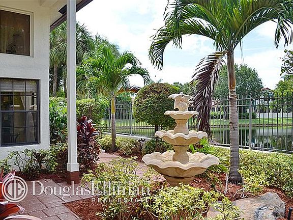 Stunning wraparound lake views abound from this beautiful home on the best corner lot in Club Villas! Ultra private waterfront location. Private elevator. Bright open floor plan boasts soaring ceilings, tile floors down & real wood floors upstairs. Formal living w/fireplace, formal dining room plus family room & breakfast area. Second floor master offers huge walk in closet, updated bath w/spa tub & shower & dual vanities. Open kitchen with honey wood cabinets, granite tops, updated appliances & opens to FR & breakfast area. Tropical lushly landscaped courtyard entry, large open patio plus screened area perfect for outdoor entertaining. Hunter Douglas shades & plantation shutters. 24 hour manned gate, sidewalks, heated comm pool & spa. Walk to tennis,Greenwise Publix, shops & restaurants.