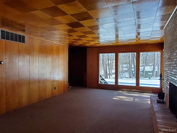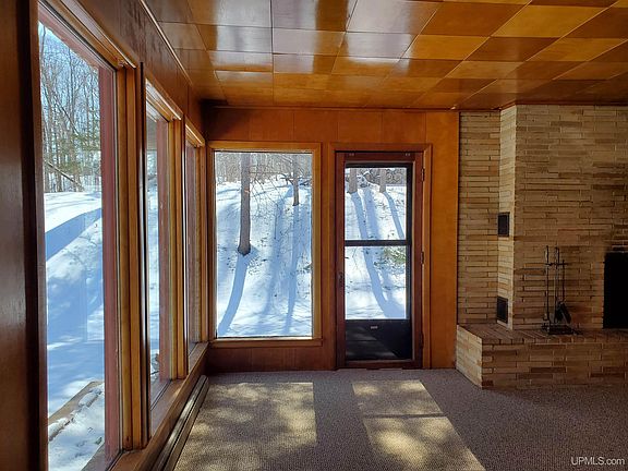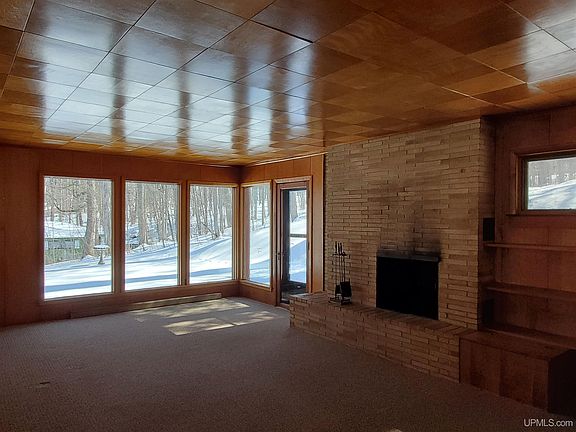 Classic mid-century home in Portage Township. Spacious living room features large, picture windows with views to the back and side yards; a wood-burning fire place with built-in wood box nearby; built-in shelves; and real-wood paneling that gives everything a warm, golden glow. Dining room opens to both the living room and kitchen and has a pantry closet. Efficiently designed kitchen features a peek-a-boo view of Portage Lake and laundry area. Refrigerator new in 2022. Rounding out the first floor is a ½ bath and a welcoming entry way with a ceramic tile floor, large coat closet, and built-in bench with storage for boots or winter gear. Upstairs you’ll find 3 nice-sized bedrooms, a full bath with newer tub & shower insert, and a 4th room that could be an office or another bedroom (no closet here). The largest bedroom has access to an exterior staircase. The basement is ready to finish if desired. There is a space that would make a perfect family room and features another wood-burning fire place. There is an area set up for a workshop. Plumbing and drain in place to add another bathroom if desired. Access to the 1-car attached garage is here as well. Furnace new in 2019. Other updates include new carpet and paint in 2021. Large yard with a charming flagstone patio backs up to a wooded area with old-growth oak trees. Within walking distance to MTU. Township taxes. This information has been secured from sources we believe to be reliable, but we make no representation or warranties, expressed or implied, as to the accuracy of the information. References to square footage, lot size /dimensions, and age are approximate. Buyer must verify the information and bears all risk for inaccuracies. Winter tax amount has been estimated. Taxes may change upon sale.
