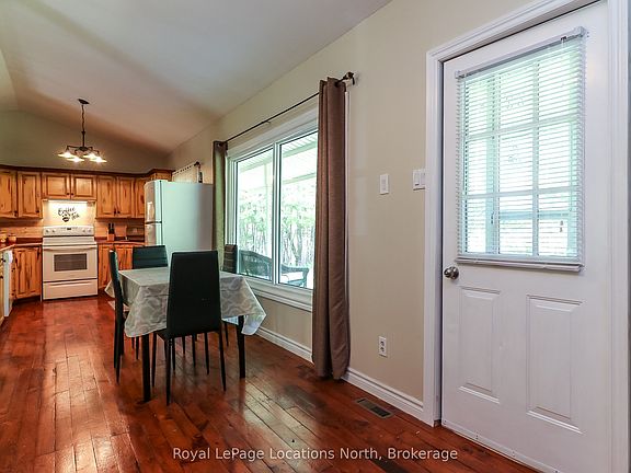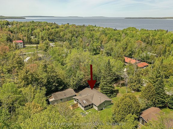 2 min. walk to Georgian Bay. Walking trail and beach access is directly across the road from this year round 2 bedroom cottage/bungalow. It has a warm cozy feel with an open concept design with vaulted ceilings, wood floors and gas fireplace in the living room. The forced air natural gas furnace as its primary heat source. Recent upgrades include new laminate floors and windows in both bedrooms in 2024, wood decking replaced in 2024, carpet replaced in the 3 season sunroom and new eavestrough in 2023, septic tank pumped and inspected in May 2025. Appliances and furniture in house are included. Beautiful private lot 100 ft x 150 ft. with a circular drive. Serviced with municipal water and connected.