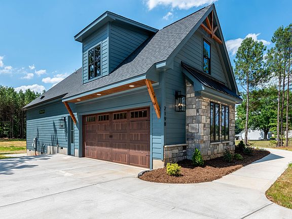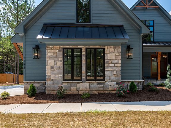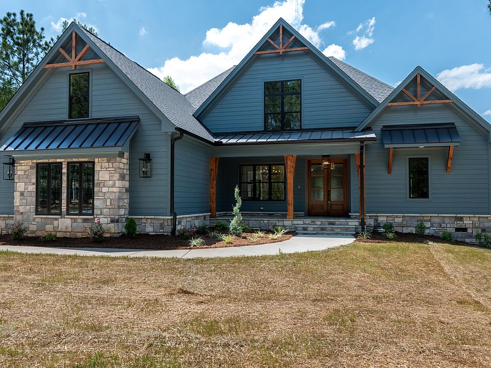 New ColeBrooke Custom Homes offers an acre plus lot with mature trees. The exterior boasts fiber cement siding with stone accents, wood brackets, and metal roof accents. A two-car side-load garage with utility sink and concrete drive Double mahogany doors open to an elegant foyer and formal dining room featuring custom wall and ceiling trim accents. An open living area showcases a fireplace surrounded by floor-to-ceiling stone and a wood mantle, flanked by custom built-in cabinets and shelves. An elegant coffered wood ceiling with a large cove crown adds a touch of sophistication. Double sliding doors open to a 17x12 screened porch, 10x8 grilling deck, and expansive backyard. The custom wood-stained kitchen features cabinetry with quartz countertops, a large island with bar stool seating, and a butler's pantry. The utility area off the kitchen includes a walk-in pantry, drop-off bench, and laundry room with a utility sink and folding counter. A guest bedroom and bath are conveniently located on the main floor. The master suite, also on the main floor, boasts wood beams and transom windows. A large walk-in shower features a rain head, bench, and wall niche. A walk-in closet with custom wood shelving provides ample storage space. The second floor has two bedrooms with walk-in closets and a large game room with access to an HVAC/storage room. An additional 300+ square feet of walk-in storage space can be used for future expansion of heated living space. Utilities: County water, septic system, Spectrum cable, and Wake Electric. Propane provider for tankless water heater, fireplace and cooktop selected by new homeowner.