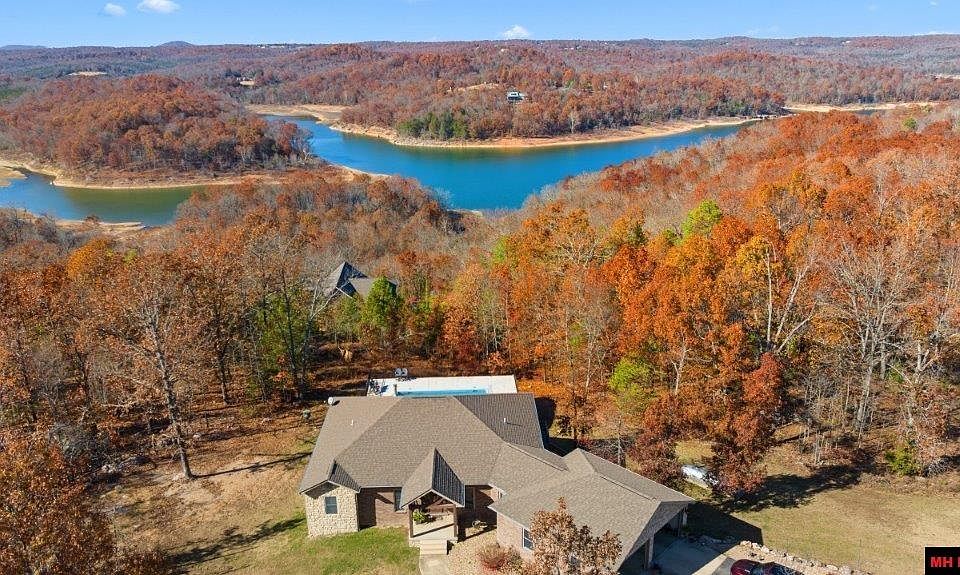 Where your dream home becomes a reality! All brick, custom built home is nestled on 3 acres and overlooks the Fall Creek arm of Lake Norfork, along with beautiful countryside views. Main level boasts an open floor plan with living room, dining area & kitchen flowing together to make gathering of friends / family a joyful occasion. Custom kitchen cabinetry w/slide out shelves, granite countertops & additional serving area w/glass front cabinets. Walk in pantry with built-in shelving & coffee bar. Master bedroom suite has walk in closet, bath w/soaker tub & tiled walk-in shower w/dual shower heads. Walk-out basement has two bedrooms, full bath, small bonus room opening to a safe room & a large partially finished bonus room that leads to pool area. Built-in salt water pool, heated and cooled. 40 x 60 insulated metal building w/concrete floor, heated / cooled. See Associated Docs for all amenities
