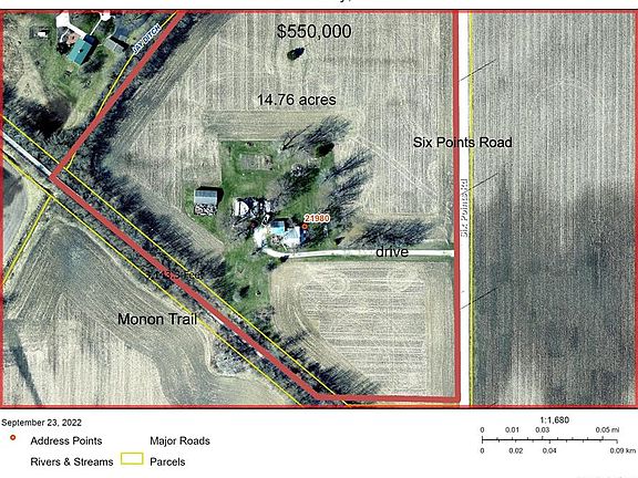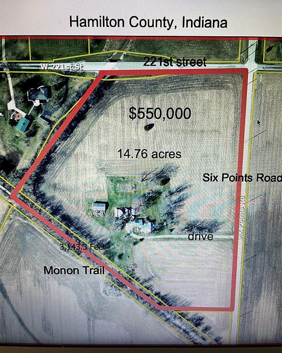 14.76 acres with road frontage on 221st and Six Points road. This property also has frontage and access to the paved monon trail. Beautiful lot with mature trees and a creek on the back side of the property. Presently has a home and outbuildings but anticipated tear down to make way for a new estate or estates. Home is in bad shape and access to the home will only be allowed under special circumstances.