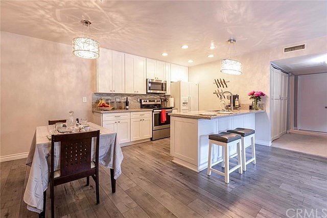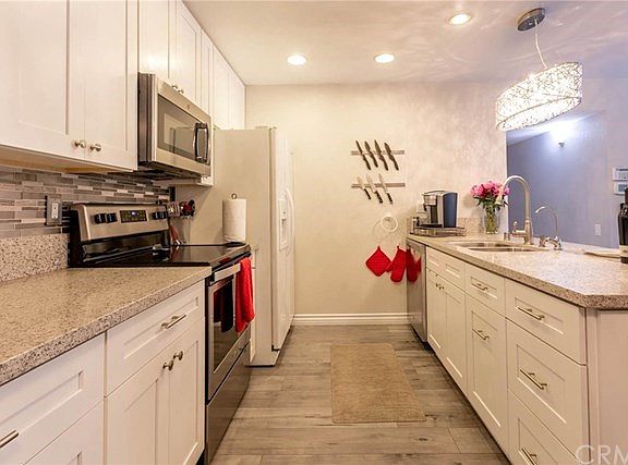 Perfect home for first time buyers! This upgraded 2 bedroom 1 bath upper level home features an open floor plan and an amazing kitchen with large island that is perfect for entertaining. Kitchen upgrades include beautiful quartz countertops, white cabinets, 2 Chandeliers, recessed lighting and grey laminate flooring through to the living room with new paint and baseboards. There is a large laundry room with cabinetry on the way to the bedrooms. Both bedrooms are spacious with walk in closets. The second bedroom has a sliding glass door that leads out to your private porch perfect for quiet evenings in the summer. This home also features central heat and air which is rare for this community. The HOA also covers water and trash. Walking distance to Rimgate park which features basketball, tennis courts, and playgrounds. Close to freeways, shopping centers, Lake Forest Sports Park, and the Irvine Spectrum. Alternate conventional and Zero down financing available.