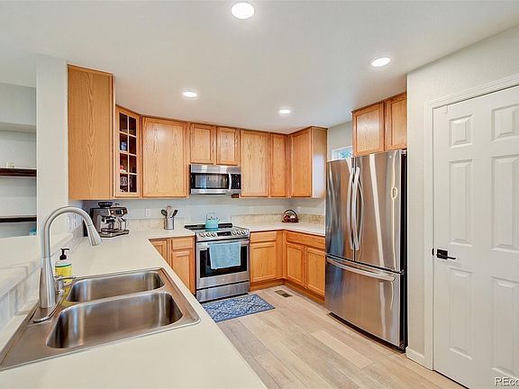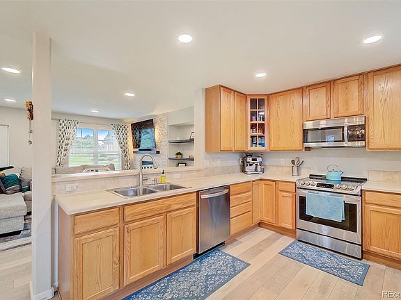 Gorgeous end unit townhouse in Ridgeview Eagle Bend. Updated kitchen with breakfast bar, stainless steel appliances, ample counter space, and pantry. High end wood like flooring throughout the main level, the living room has a fireplace with custom tile surround, and built in shelving. Upstairs you will find the luxurious master suite featuring 5 piece master bathroom along with an additional bedroom and bathroom. The fully finished basement encompasses the laundry room, and the third bedroom! Great low maintenance yard and patio. The community has a private pool, and dog park! Located near parks, shopping/restaurants, minutes from Saddle Rock Golf Course, easy access to 470, and located in the Cherry Creek School district.