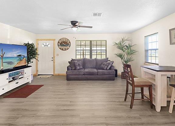 This open concept 3 bedroom 1 bath has been fully remodeled and is just waiting for its new owner. No detail was overlooked renovating this home. New vinyl plank flooring throughout, fresh paint, new doors, trim and baseboards have been replaced with rustic finishes. Kitchen is open to living room and features all new cabinets, countertops and appliances with loads of storage and a massive pantry. Bathroom has new vanity and shower (glass doors are included but not installed). The inside was not the only area to received upgrades. Home also boast a new roof, new AC and new windows. Enjoy your fenced in front yard while sitting under large covered front porch. This house as so many features to offer and sits on just shy of an acre! Seller is willing to sell all furnishings, washer/dryer and brand new riding lawn motor separate from the home. Please allow 5 days for sellers response.