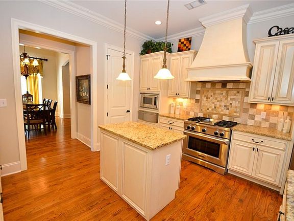 Gorgeous home with soaring ceilings and high end finishes! Double doors lead to elegant Foyer revealing heavy crown molding & recessed lighting throughout main living areas. Formal Dining Room off of Foyer is accessed through arched entry. Foyer opens to Great Room with lots of windows, gas log fireplace, & French Door access to back porch. Upgraded Kitchen boasts custom cabinetry, SS appliances, eat-at bar, tiled backsplash,spacious walk-in pantry, & butler's pantry. Large Breakfast Room is surrounded by windows and offers built-in Kitchen desk with cabinetry for extra storage. AWESOME Den off of Kitchen offers a second gas log fireplace & tons of built-ins. Master Suite is finished with hardwoods and can accommodate a sitting area. Spacious Master Bath offers step-in glass shower with tile surround & built-in bench, private WC, double granite vanities, & a jetted tub. Huge walk-in closet with built-ins accessed through Master Bath.