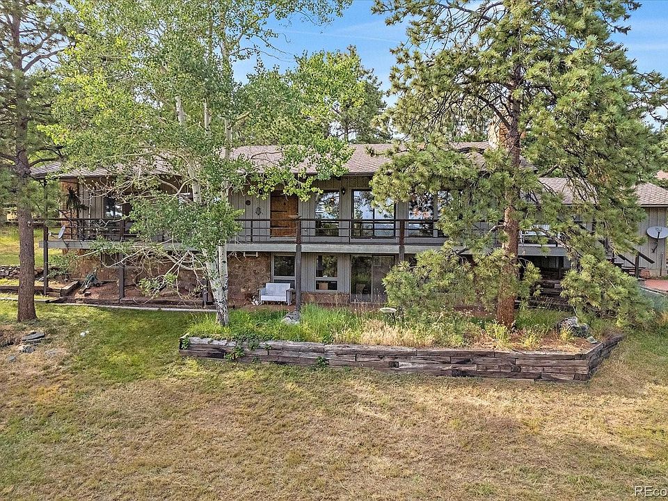 This impressive home is nestled on a gentle half-acre lot, tucked away on a private cul-de-sac in the coveted Lookout Mountain Panorama Estates. Featuring an entire wall of windows that flank the house to the south and capture the sun and views. The home is charming with tons of character and good bones. Boasting an open-concept layout, exposed trusses vaulted ceiling, and a stunning moss rock wall surrounding the wood-burning fireplace. The main level includes a secondary bedroom or office and the primary suite. The primary suite enjoys a cozy gas fireplace surrounded by a moss rock wall, abundant south and westerly-facing windows, and connects to the beautifully updated main-level bathroom. The walk-out lower level is ready for entertaining, featuring a huge recreation room, which includes a full bar with a kitchenette, a wood-burning fireplace, an office with a hidden entrance, and two more bedrooms. The lot is park-like and fire-mitigated, capturing far-reaching mountain valley views, is steeped in sunshine, and you can see Pikes Peak on a clear day. The roof was replaced in 2010 with a Class 4, 50-year roof, and the Jeffco use permit has been issued on the septic system. There is RV parking next to the garage and shed, and Comcast high-speed internet is available in the neighborhood. Just a short walk down the end of the road is the private neighborhood access to the Jeffco Open Space Apex Park Enchanted Forest trail for a beautiful hike only minutes from home. This is an amazing property with so much to offer in a neighborhood boasting multimillion-dollar homes with a million-dollar view.