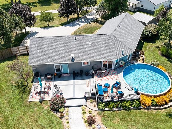 EXQUISITE CUSTOM 4+ BEDROOM RANCH ON 10 ACRES WITH MULTIPLE OUTBUILDINGS! This fully renovated home offers luxury living in a serene country setting. The gourmet kitchen is a chef's dream, featuring an island, quartz countertops, pantry, butler's pantry, and a convenient pot sink over the stove. The great room impresses with vaulted ceilings and a cozy fireplace. The master suite is your private retreat with a walk-in closet and an elegant bath, complete with a jetted air soaking tub and separate shower. The finished walkout basement provides additional living space, including a family room, large bedroom, and two non-conforming bedrooms. Outdoors, enjoy the above-ground pool, two-tier deck, and firepit area—perfect for entertaining or relaxing. With ample room for horses and a 60x30 barn plus a 40x30 detached garage, this property offers both luxury and functionality. Don't miss this unique opportunity!