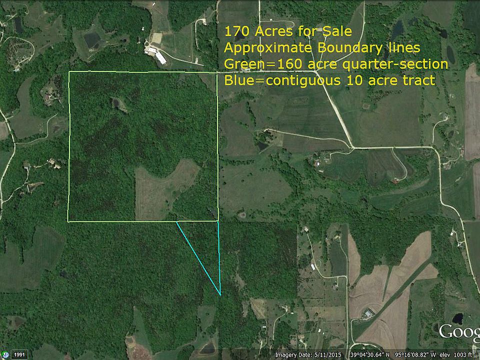 Rare opportunity to own a paradise for wildlife in one contiguous tract of 170 acres, most of it covered in mature trees, including white oak, burr oak, walnut, black cherry, mulberry, and hickory. Nearly 20 Acres of remnant native prairie. Just 8 miles from downtown Lawrence, this spectacular land features high ridges with grand views, deep wooded valleys, creeks, and ponds. Complete privacy and seclusion are yours on this expansive wooded acreage, yet only minutes to town and major highways.