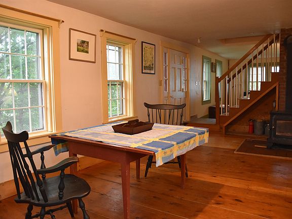 Traditional 3-BR, 1 1/2 bath Vermont farmhouse with all of the charm intact, on 0.9+/- acres, privately sited at the edge of the Village. Exposed wide-plank softwood flooring throughout both living levels. The open floor plan has been heated primarily with the centrally-located Hearthstone soapstone woodstove. You'll enjoy the newly-installed Haier Advance Plus Arctic Highwall heat pump/AC 24K heat pump, on the humid days of Summer, as well as the colder days of Winter. Kitchen remodeled in 2021 (insulated, wiring updated). Modern bathrooms. Built-ins. Even a lazy window (aka witch window)! Attached barn, which has undergone stabilization efforts (sill replacement and concrete footings added), provides workshop, storage, wood shed, plus an 18'x11'6+12'x12' heatable studio upstairs(propane heater is not currently connected to propane). Landscaped with perennial plantings, vegetable garden spaces, majestic mature trees, stone accents, and views of the Village of Chelsea's spires. Make time to take a look at this history-filled home. You won't be disappointed. Sellers have done extensive lead-in-water testing, which determined there were no lead hazards discovered in the samples submitted. Lead-based paint hazards test results also attached, as reference.