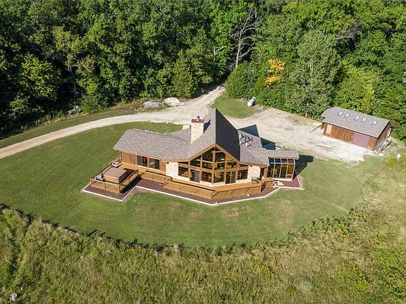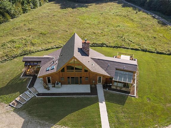 This timberframe home sits on 50.76 acres, features post & beam construction. The A frame design emphasizes light, with floor to ceiling bronze filtered windows, with views of the beautiful scenery. Tile flooring throughout the home's lower level. Dining room and primary bath feature greenhouse design. The chef's kitchen features a 13ft red dragon granite countertop with a uniquely shaped stainless sink. The primary bedroom has sliding doors leading to a hot tub and wrap around deck. Bathrooms are tiled, with granite sinks. Primary bathroom has an infinity tub, the second bath has a copper Japanese soaking tub. Loft has vaulted ceilings, amazing views, and lots of space. Home has zoned heat/AC, water softener, Jenn Aire appliances, a security system, and extra wide doorways. Floor to ceiling stone woodburning fireplace with gas starter. Two additional buildings; one a garage/office with heat, AC, and skylights, and one with four rooms, heat /AC, with an indoor/outdoor sound system.