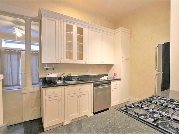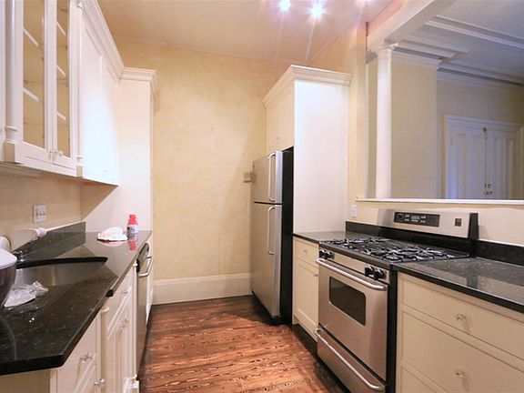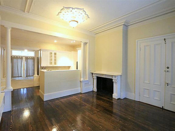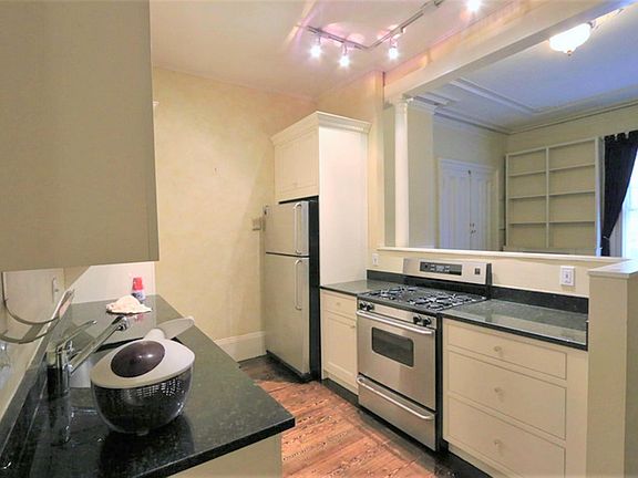 1st floor apartment. All hardwood floors. Heat is included in the rent. Enormous living room with dark hardwood and lots of custom built-in shelves. Beautiful galley open concept kitchen with custom cabs, granite, stainless appliances including dishwasher. Open area in back could be a bedroom or a dining room. Apartment has very nice built-in Murphy bed. Very cool shared roof deck. Nice private back porch and shared yard!! Big walk in closet / storage area. Street parking only. Ref 180098