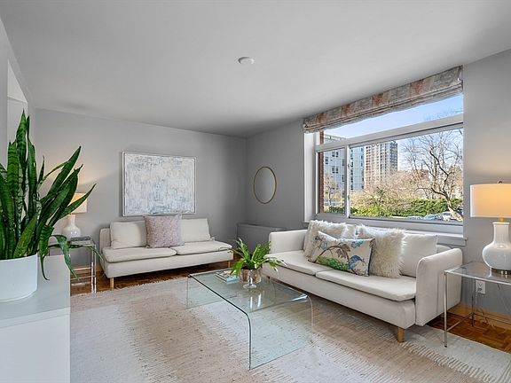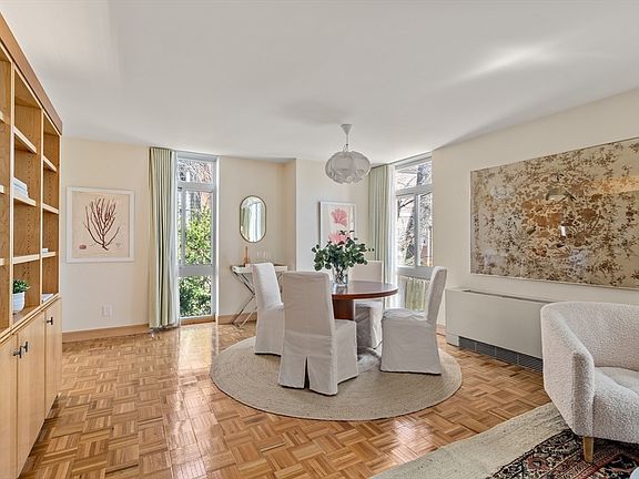 Private, off-street setting, this contemporary, duplex overlooks landscaped grounds. The gracious entry leads to an expansive living room that fills with light through picture windows and a glass slider. The living room opens to a deck that leads to a beautiful park-like common garden. Elegant entertaining in the open dining room. The architect renovated kitchen has European style, custom maple cabinetry, Subzero & solid surface counters. A family room offers a sanctuary on the east side of the home. High ceilings, large windows and parquet oak floors continue to the second level. This floor is a quiet oasis with en suite primary bedroom, To the back of this floor are two additional bedrooms that share a three piece full bath with laundry room. In addition, there are generous closets throughout. Enjoy the amenities of the full-service Riverview building with 24/7 concierge, private park and convenience.