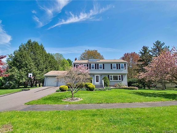 Rarely available Colonial on quiet cul-de-sac. Families buy to stay; a property is seldom on the market in this neighborhood. This home has everything on a buyer's wish list: location, huge level yard, 4 bedrooms upstairs, master en suite with walk-in closet, central air, public utilities and natural gas, two living rooms, updated kitchen, sun room, composite decking, 2-car garage, solar panels, tons of storage and a finished bonus room in the basement. With over 2000 sq feet, this home has everything a family needs. Road is across from a wildlife reserve. Property is 3 minutes to Target, Stop N Shop and I-91. Only 5 minutes to downtown.