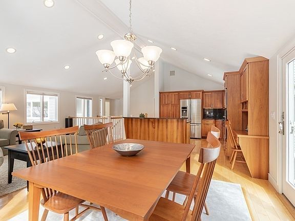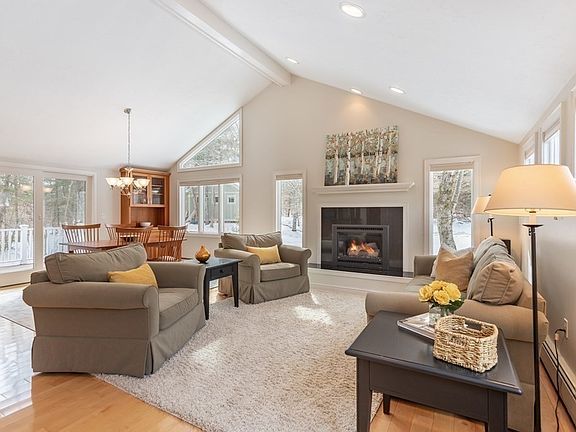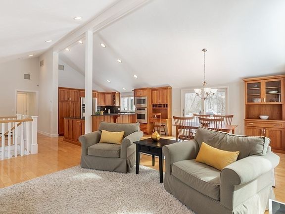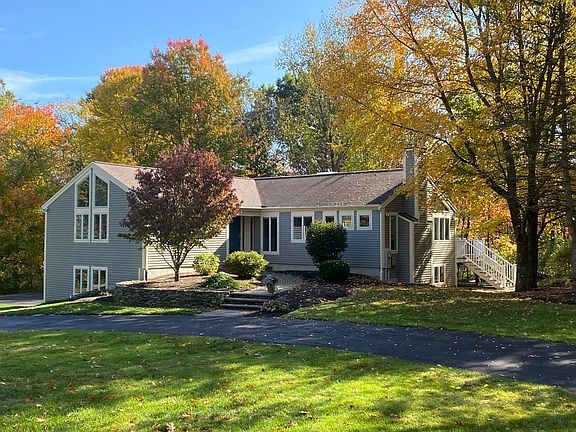 Once in a while a property is so special it just strikes you! This timeless contemporary home is simply captivating and is privately nestled-in on a beautiful, scenic lot abutting conservation land. Offering comfortable & casual living the flexible floor plan includes 3/4 bedrooms, 3 full baths, an office for working from home, and the potential for in-law suite. Buyers will fall in love with the amazing natural light, cathedral ceilings & enormous windows. The open concept living room w/gas fireplace, dining rooms w/double glass slider to the expansive deck, and the fabulous granite & natural cherry cabinet kitchen with SS appliances and breakfast bar are all stunning. The master suite boasts double walk-in closets, private bath with dual vanity, jetted tub and shower. A mudroom with laundry offers white cabinetry & storage. An oversized 2-car garage and an attractive outbuilding/shed for additional storage. Ideal spot to relax and take in the exquisite surroundings. Truly a gem!