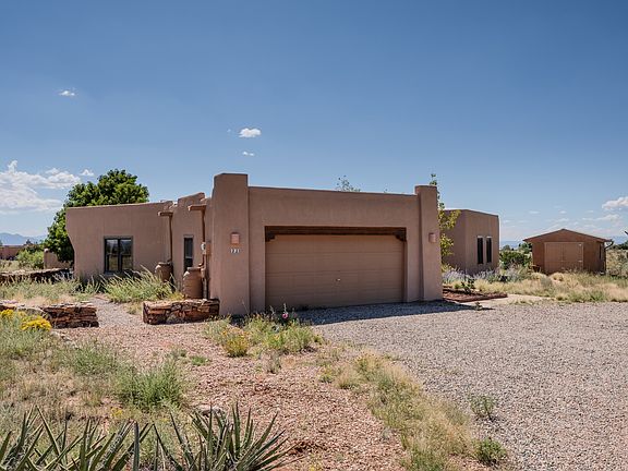 Elegant contemporary, open plan great room design built by Sierra Homes located close to the front of Eldorado. Wonderfully light spacious flow with Santa Fe detailing throughout. Enter from the foyer into a large great room with a Kiva fireplace with a cheery wood burning Regency insert for supplemental heat, tile floors and high viga ceiling. The natural gas radiant heating system is Entran 3 and domestic plumbing was found to be copper and pex. The roof was additionally covered by BAC Enterprise Roofing systems in 2011 with a life time warranty on the materials. A roomy cooks kitchen and plenty of room in the adjoining dining area. From both dining and living areas one looks out to the sunset southwesterly mountain views, and flows out to a large portal for dining out or entertainment. The main bedroom with large spa like bathroom and walk in closet is nicely separated from the guest bedrooms. A lovely family room addition with built in cabinetry including a wine cellar, waterproof vinyl flooring and shaded by a large peach tree is ready to relax in. The privately walled, beautifully landscaped garden delights the eye and extends across the south side of the home-plenty of party room. This home is located close to Eldorado amenities, trails, local shopping , school, library and senior center and is only minutes into Santa Fe. A must see on your home shopping list.