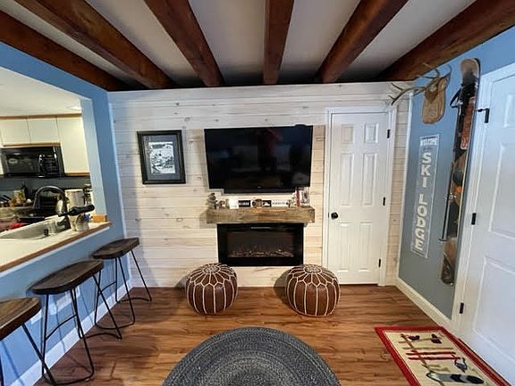 The nicest unit ever at Riverbend! Completely remodeled and updated first floor living with one bedroom and spacious living room/kitchen/dining area. Located at Riverbend on the Sunday River. Great location less than 2 miles from Sunday River Ski Resort and the golf course. This beautiful post & beam unit has all new flooring, lighting, applainces, vanity, built-in bunks for the children, charming electric fireplace in the living room. Mudroom for gear and ski storage, deck and private entrance. You won't find a nicer unit!
