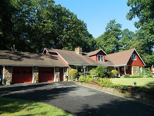 Enchanting stone and wood Mid-Century home is nestled on 2 acres of landscaped and park-like property on a quiet cul-de-sac street. Bright and airy, this lovely home features a gracious open floor plan of living room with beautiful millwork, wood-burning stove and granite floors that flow into the formal dining room with large picture windows bringing nature in. The updated kitchen is appointed with custom cabinetry, granite counters, glass tiled backsplash, breakfast bar and stainless steel appliances. The kitchen flows into the family room with tiled floors, fireplace and windows overlooking the fabulous paver patio, porch and gardens in the front. Completing the main floor is the master bedroom, master bath, second bedroom, full hall bath and mud room/ laundry room.The second floor offers more living space with a third bedroom, full bath, office and large landing media room. The many amenities include radiant heated floors on 1st floor, plenty of closets and storage, attached 2-car garage and a bonus of a large barn for storage. Charming 3 bedroom, 3 bath home is ideal for relaxed entertaining, tranquil enjoyment of the surrounding nature yet close to all. Simply perfect for a comfortable contemporary lifestyle!
