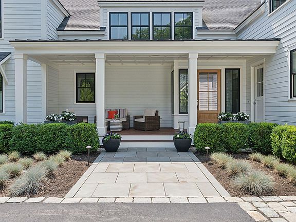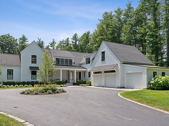 This contemporary farmhouse in Cumberland Foreside, designed by Kevin Browne Architecture and built by Michael Monaghan, blends modern elegance with timeless charm. Set on a private 4-acre lot, the property includes an expansive backyard, lovely landscaping with uplighting, covered porches with mahogany decking, and a stone patio with a natural gas fire bowl. The exterior, with its classic black-and-white palette and modern clapboards, fits beautifully into the neighborhood. Inside, large south-facing windows bathe the home in natural light, creating a bright and inviting atmosphere. The open floor plan seamlessly connects distinct yet cohesive spaces, ideal for versatile living. Walnut flooring adds warmth throughout, complementing the home's sophisticated design. The kitchen features stunning Bianco Rhino marble countertops, commercial-grade appliances, and a large island open to the living area. This space boasts a double-sided gas fireplace with sepia-toned travertine tiles, enhancing the home's cozy ambiance. Custom and designer finishes abound, including double-sided mahogany shelves, built-ins, and floating vanities. The primary suite offers wraparound glazing, floating cherry vanities, and a luxurious soaking tub. The bathrooms are meticulously designed, offering both style and functionality. The flexible floor plan includes options for a first or second-floor primary suite and laundry on both floors, catering to varied living preferences. Unique touches, such as the library's sliding metal doors crafted by a local artisan and see-through bookshelves, provide functional elegance. Cumberland's public beach is only minutes away, perfect for leisurely afternoons and coastal walks. Additionally, Portland's dynamic offerings are easily accessible, providing an array of dining, shopping, and cultural experiences.