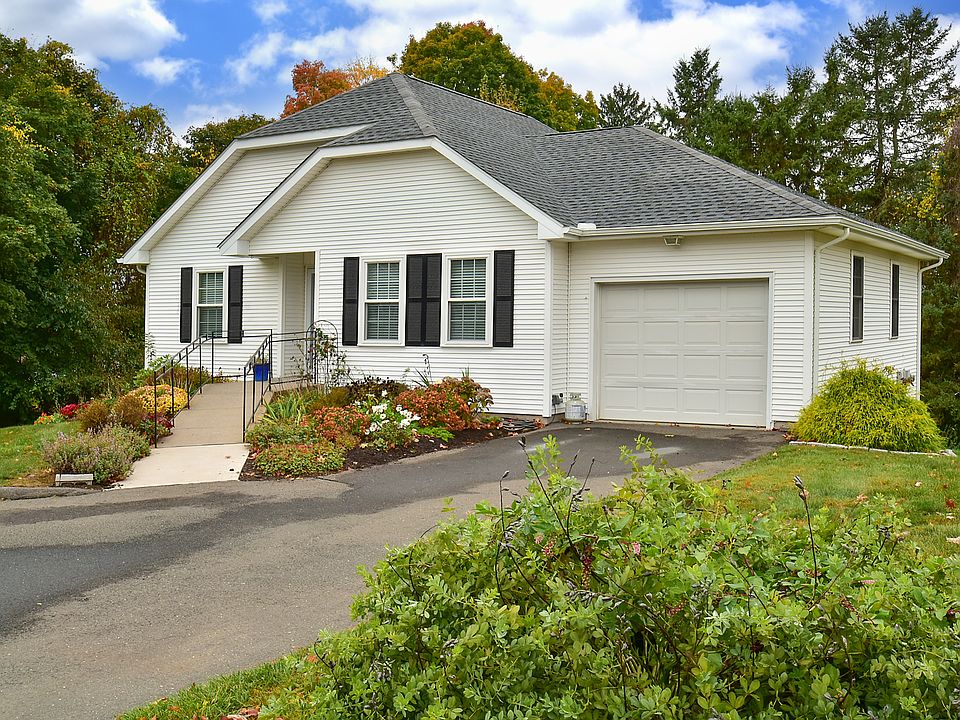 Light, spacious and with excellent upgrades, this immaculate two bedroom, two full bath ranch home in a lovely cul-de-sac 55+ community is truly move in ready! Large windows throughout shine on new, gorgeous hardwood floors! The renovated kitchen features a five burner gas stove, all stainless steel appliances, wonderful granite counters, and pristine white cabinets! The open floor plan living room and dining area lead to sliding doors. Enjoy nature any time of day on a new trex deck ready for outdoor dining and relaxing. The oversized primary bedroom has a walk in closet and ensuite full bathroom. The second bedroom has an extra deep closet and also would be a terrific home office or den. Both spotless, updated bathrooms feature new vanities and a warm neutral color palette. The garage with direct access to the laundry room makes arriving home and unloading groceries so easy! There's also an enormous, high ceiling walk out basement with full sized windows that offers tremendous storage and expansion options. A new roof and new windows all in the last 5 years! Central air and efficient gas heat! Great location convenient to shops, restaurants, medical offices, town services and more. Easy living with all exterior needs addressed by association. Schedule your appointment starting 10/15/24