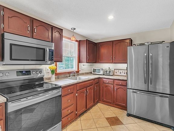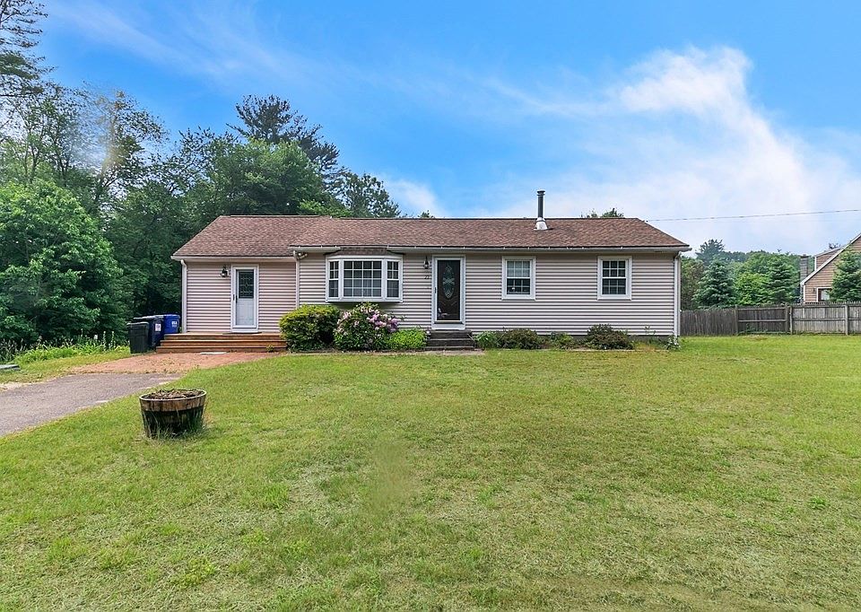 Come check out this updated ranch with a beautiful open living room boasting a wooden tongue and groove cathedral ceiling. Lots of privacy on the end of a cul-de-sac with a large open yard. Separate dining room and a spacious kitchen which includes stainless steel appliances. Lots of outdoor space to entertain and enjoy. Property abuts conservation land and has 2 sheds for storage. Basement partially finished with a full bathroom and space for office, gym or more indoor entertainment. It is a must see!