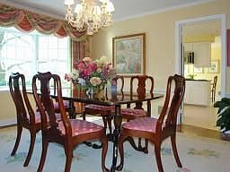 The main level offers a grand liv ing room with fireplace,formal dining room,family room with fireplace and french doors to a terrace and gardens and a sparkling new eat-in kitchen.A half levelup are three bedrooms and two full baths and another level up is a secluded master bedroom suite.