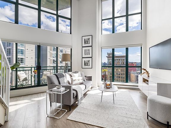 Amazingly spacious loft in The Van Horne Building located in the heart of Gastown! With over 590sqft this 1 bed, 1 bath concrete loft with in-suite laundry is perfect for Investor or First Time Buyers. Over height 15' sky-high ceiling with floor to ceiling windows provide remarkable bright light into this expansive home. The fresh open kitchen flows into your main living area w/direct access to your sun filled balcony with city views. Generous sized bedroom on the upper floor is large enough for an office nook. Live with peace of mind with a well- maintained concrete building, live-in care taker, serene courtyard w/bbq, and plenty of guest parking. Great location steps from amazing coffee shops, cafes, restaurants, shopping (Nesters, London Drugs) and transit. Open House Sun May 21, 2-4pm