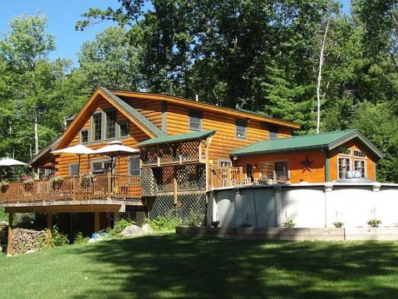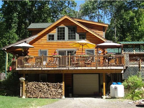 Stunning log home with quality appointments throughout. Set on a 3 acre private lot with a nice shed, lush green lawns, mature landscaping, farmer's porch, large decks, entertaining/bar area and a swimming pool. Featured as you enter the home is an open concept kitchen dining room area. Exquisite gourmet kitchen with solid wood cabinets, spacious island, Fisher Paykel Dual Oven 6 burner gas stove, Fisher Paykel dual dishwasher & top of the line Maytag refrigerator. The dining room is grand with cathederal ceilings and a wood stove. There is a First floor master suite, large living room with vaulted ceiling, gas stove, large windows and direct access to back porch. The second floor includes 2 bedrooms and a large loft style sitting area. The lower level has an additional family room, large laundry room and a 1 car garage. Only 4 years old, very well maintained and awaiting a buyer to take advantage of the warmth, integrity and efficiency that this quality log home has to offer.