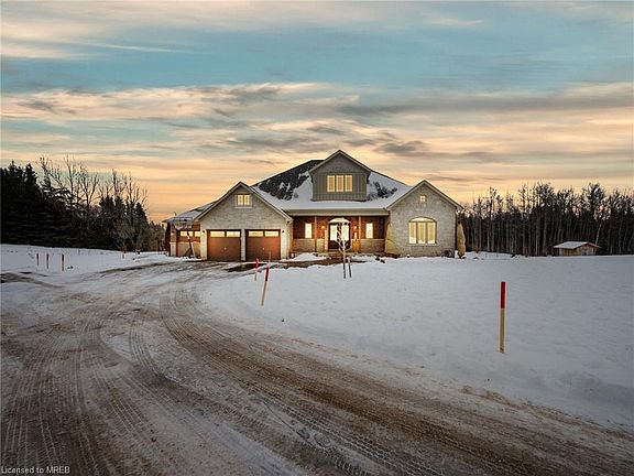 This one of a kind custom built estate home offers the perfect blend of country living with all the conveniences of nearby restaurants, schools & shopping. Located just outside of Shelburne & 15 minutes from Orangeville, this spectacular bungalow is positioned on a 1.6-acre lot surrounded by mature trees & stunning landscape. As you approach the home you will be greeted by a functional three-car garage, paved driveway and stamped concrete walkway. Rich hardwood floors expand throughout most of the home. This custom kitchen is complete with ss appliances, quartz countertops, travertine backsplash & island. The kitchen overlooks the grand living room with jaw-dropping views of the backyard oasis. With cathedral ceilings, gas fireplace, and walkout to a sizable backyard deck, the living room offers a ton of natural light and is the perfect place to entertain. The formal dining room further features a feature wall and another deck facing the tree-lined backyard. The master bedroom is equipped with 4 pc ensuite bathroom and large walk-in closet. On the main floor, there are two more bedrooms with Jack and Jill four-piece. Main floor laundry room includes additional storage & garage access. The 3-car garage has been professionally finished. Make your way down the hardwood staircase to the basement that has been completely finished with a functional basement apartment. Equipped with a 3 piece bathroom & two large bedrooms. The open rec room is finished with laminate flooring, kitchen, stone finished feature wall & walkout to the backyard. The basement features an office and family room. Wait until you see the backyard! Boasting two upper decks and a basement walkout to decorative patio stones. Enjoy your morning coffee on the deck next to the water fountain feature as you look onto the sunrise. Nestled into a quiet country community with a neighbourhood park & pond. This estate property offers all that country living has to offer with all the town conveniences.