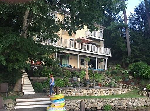 Wow! Forge Pond WATERFRONT Contemporary Colonial home with sunset views, and your own private patios, dock, oasis. Drive up to the 2011 three car, two story garage and workshop, 200 amp electric, heat. Unexpected convenience. Stone and wood detailing blend into extensive professional landscaping. The 2005 custom home boasts luxury details; DR, LR with vast water views, beautiful trim, stone Fireplace, private Office. Huge Kitchen- tall maple cabinets & copious counter space. Island for cook top and food prep. Open Concept spaces are able to be closed off from the fray with pocket doors creating private enclaves. Upstairs, each bedroom is magical- views of the lake, soothing colors, enormous storage, and baths so well appointed you may want to linger. The Master has enormous walk in closet, luxurious Bath.The third floor partially finished Loft allows for home office or guest use with even more storage. Below it all, basement 8' sliders pull in natural light for more. Soul Soothing Home