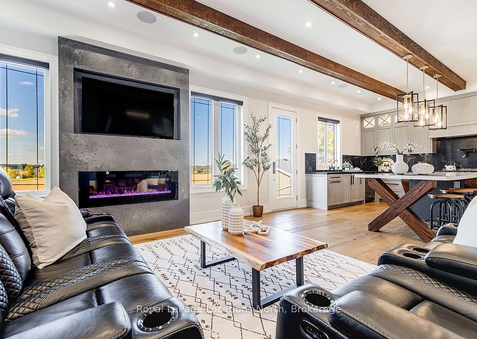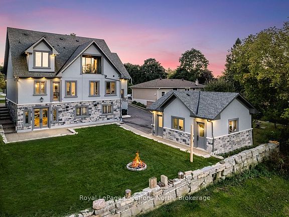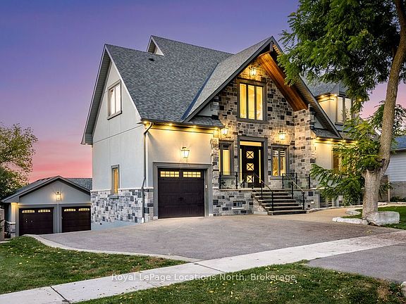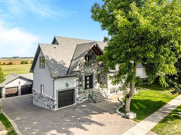 BACKS ONTO PROTECTED LAND. This stunning luxury home is situated on a quiet dead-end st, w/views of the countryside, + steps from park/rink/courts/library. This thoughtfully designed home offers an elegant, vibe, w/high end craftsmanship, featuring a stone + stucco exterior w/exceptional curb appeal. Upon entering, you are greeted by a grand entrance w/ heated porcelain tile floors, a custom wood staircase w/glass railing, + vaulted ceilings that create an inviting ambiance. The main level showcases engineered white oak flooring + exposed beam accents. The spacious living room offers custom-built cabinetry, a tiled feature wall with a built-in electric f/pl, + space for a TV. Adjacent is the elegant dining room, equipped w/ built-in cabinetry, dry bar, quartz counters, backsplash, +under-mount lighting perfect for entertaining. The family room flows directly from the dining room, offering a 2nd tiled wall w/ built-in electric f/pl, lg windows + seamless transition. The gourmet kitchen is classy, featuring an oversized island, quartz countertops, high-end s/s appliances, incl a gas range w/ a custom range hood + walk-in pantry. A private office w/views + a mud/laundry room w/heated tile floors, inside entry to garage w/ epoxy floors + w/up from basement. 25 ft ceilings impress, flowing into 2nd flr w/white oak flooring that continues throughout, leading to the luxurious primary suite. This retreat incl access to private balcony, a walk-through closet w/ built-in organizers, + 6PC ensuite w/ dbl sinks, soaker tub, + large glass shower. Two additional bedrooms each have their own 3PC bathrooms w/ tiled showers + heated floors. The basement offers versatility, featuring expansive rec room + walk-out French doors leading to the patio, providing in-law potential. This bright space offers luxury plank floor, full kitchen, 2 bedrooms, + a 3PC bathroom. Outside, enjoy an add. detached,heated 2-car garage w/ gas + water lines for future pool installation.