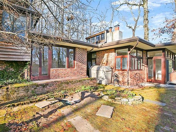 Frank Lloyd Wright inspired (designed by Edgar Tafel-protege of FLW) country home nestled into spectacular rock outcroppings on wooded 2.35 acre site on private drive walking distance to downtown Armonk w/Byram Hills SD. 3BR, 2Ba w/artist studio spaces & multiple viewing decks, patios, w/multi-level library space. Structurally sound home requires finish carpentry & renovation. Unique fixer upper. Spacious LR w/wood stove. Flows into EIK. Down the hall is a bathroom & 2BRs, 1 w/egress to patio. Up half a flight of stairs to private Main BR Suite w/Bathroom & WIC. From the MBR a pocket door leads to a multi-level library w/skylights, spiral staircase & egress to deck overlooking rock outcroppings. From the LR, doorway leads to partially finished heated multi-level artist's studio w/waste line (potential to add a bathroom) leading to garage. 4 zone heat. Amazing potential. Newer roof. Private road-only 6 homes. Separate 2 level barn on property. Artist's Studio built-1979, Library-1991.