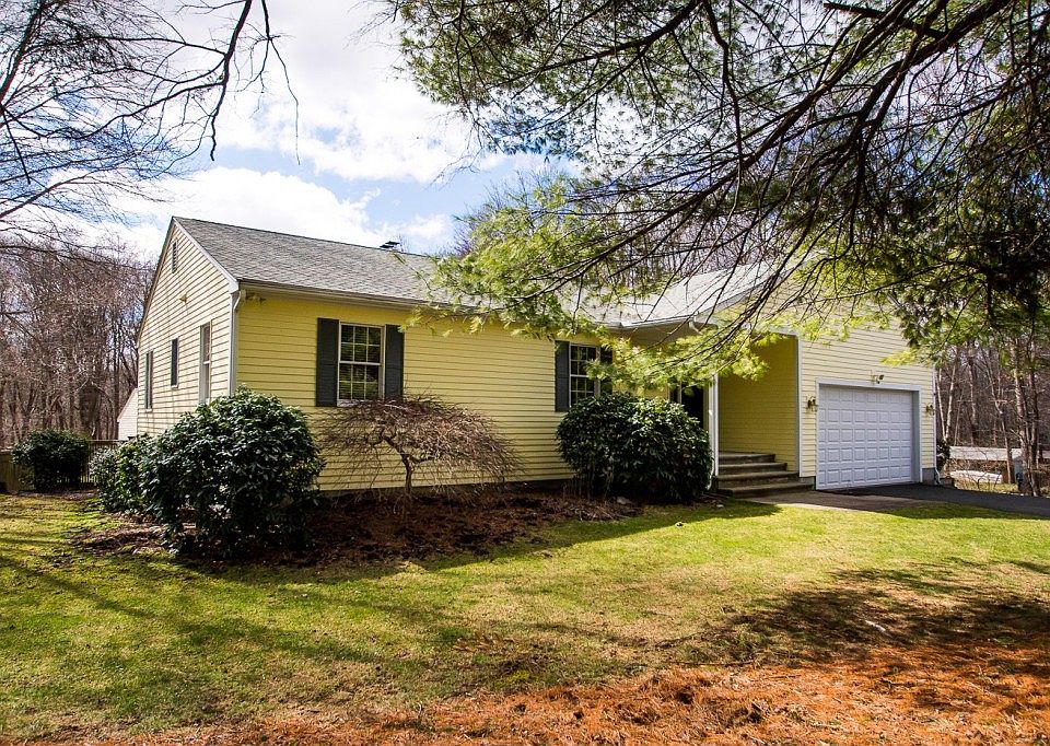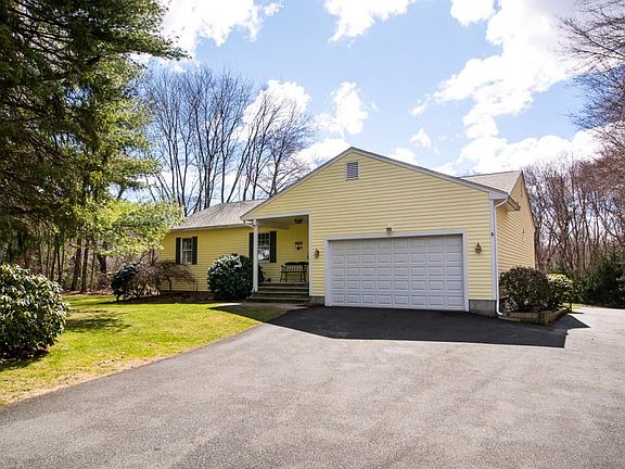 Absolutely stunning Ranch. Gorgeous shiny oak hardwood floors great you as you enter front door. Spacious open floor plan with impressive vaulted ceiling perfect for entertaining. Living room skylights and wood burning stove with beautiful stone hearth. Kitchen boast new hickory cabinets, tile backsplash, granite countertops, wall oven, and granite breakfast bar. Dining area with skylights and french doors that lead to large trex deck and tranquil private backyard. Master suite host bedroom and large room that can be an office or sitting area, full bathroom and an abundance of closets! Two other bedrooms and full bath with tile shower. Wide stairs lead back in time to a vintage diner / game room. Private office, workshop and storage complete the basement. All this PLUS Second 2-car garage/workshop on almost an acre of privacy at end of cul-de-sac. Roof replaced in 2014 and Septic in 2003.
