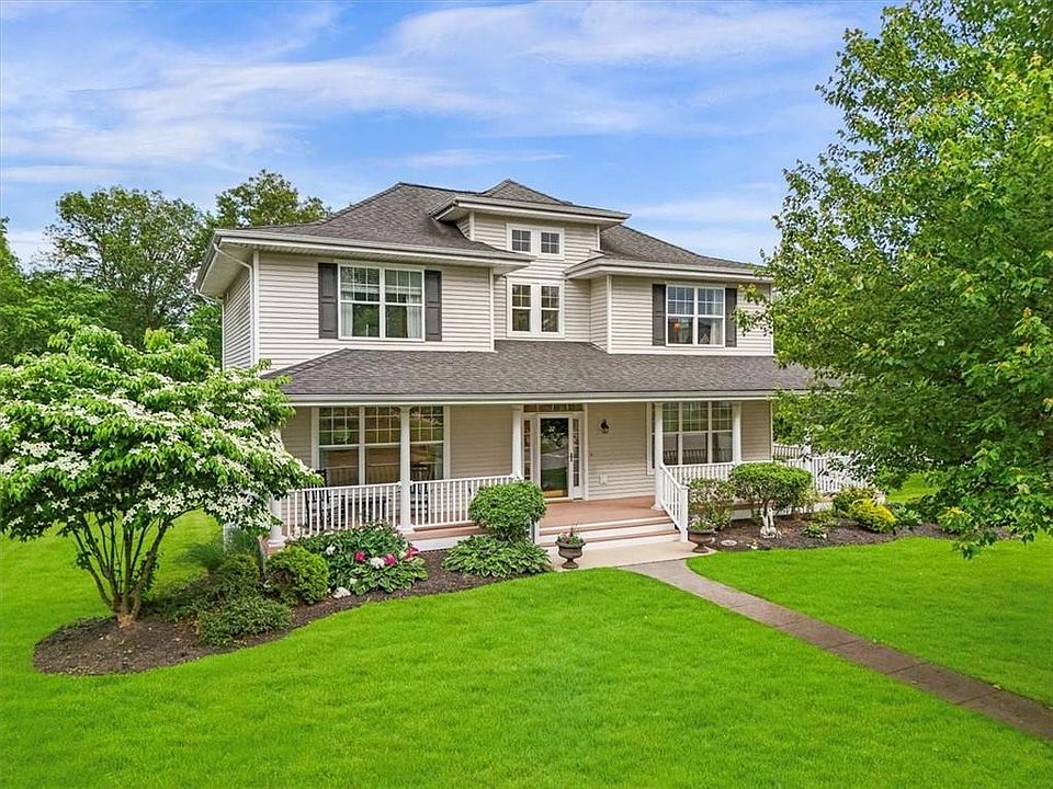 Beautiful center hall colonial home in Four Corners development with a charming wrap around porch complete with a swinging bench (included)! Enjoy the sunset on the porch or a BBQ on the Trex deck in the rear. This wonderful home offers nearly 3K sqft of open concept living. The sunny family room with cathedral ceiling, gourmet kitchen and breakfast all blended together to make everyday warm & comfy and every holiday gathering spectacular. A WCI built home with 4 spacious bedrooms, 2.5 baths and an unfinished basement with rough in plumbing ready to be finished anytime. There is a private study great for working remotely. This resort-like Four Corners development, with all it's great amenities, literally has something for everyone to enjoy, whether it's hanging with neighbors in the Clubhouse, playing ball at the indoor or outdoor basketball courts, tennis courts, pickleball court, hanging with kids at one of 2 playgrounds or take a dip in the pool. Here’s your chance to experience the height of elegance and comfort in this remarkable home and enjoy a wonderfully charming community that has something to offer for every member of your family, human or canine! Additional Information: Amenities:Soaking Tub,Tennis,ParkingFeatures:2 Car Attached,