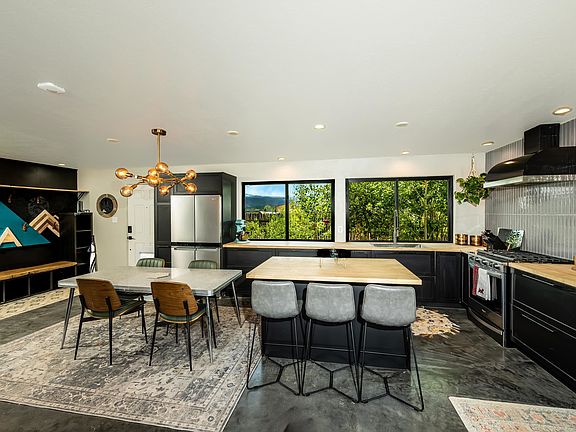 Enter the gates of this home and you're greeted by a rare garden oasis in Angel Fire, beautiful stamped concrete patio and trex deck that combined wraps around two sides of the home including a hot tub and great outdoor living space. Entering the home into the open plan living area with a functional and beautiful kitchen. Large windows bring light in from the outside and peek-a-boo views of Angel Fire Resorts' Exhibition run. This living room has a beautiful modern wood burning stove to cozy up to in the winter months. Two bedrooms including a large primary room with modern ensuite bathroom and walk in closet as well as a guest bedroom and bathroom on this level. Attractive laundry room with additional storage is just off the kitchen. Stepping down into the third bedroom/game room equipped with queen over queen built in bunk beds, pool table, 75" Smart TV, game table and a half bathroom. Through the secret door you can enter the single oversized garage with room enough for workshop space. Whole home including garage has in floor radiant heat, Updated Pella fiberglass windows, exterior painted and stained in 2024 ready for someone to come and make this space your Angel Fire retreat. Home comes furnished and turn key. Zoned residential-commercial and outside of Angel Fire Resort dues. Shed stays with the property, great storage for owners if you want to rent out on Airbnb you can store personal effects. "Carport" side of the shed can fit an ATV.