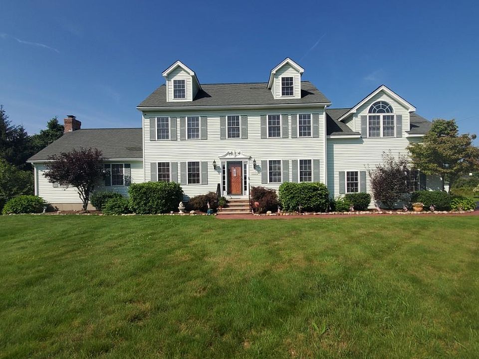 Situated in a serene country setting, this bright, sunny and spacious 10 room Colonial features a cabinet packed kitchen, recessed lighting, granite counter-tops, and kitchen island. Enjoy gatherings in the large open family living room with wood burning fireplace and cathedral ceiling. Relax in the beautiful 3 season sunroof overlooking a large deck and landscaped grounds on 1.77 acres. The Five bedrooms include a large master bedroom with double walk in closets and full bath. A fifth bedroom is located on the first floor. Need even more space? The walk up attic is finished with wall to wall carpeting, wooden ceiling, and ceiling fans. The walkout basement is partially finished as well. Freshly painted interior and all new appliances (except dryer)! This property is equipped with solar panels too! Did we forget to tell you its conveniently located to route 101 and Route 95 for those looking for an easy commute.