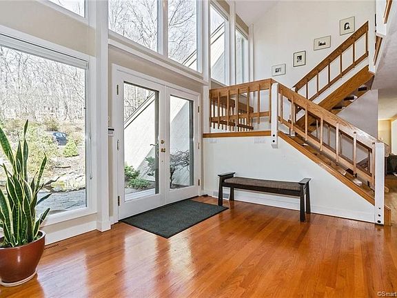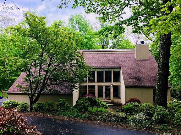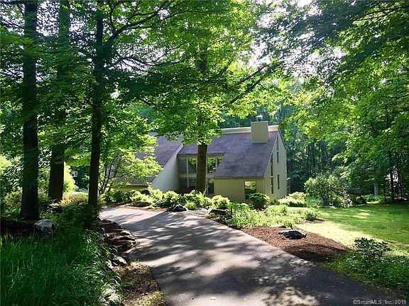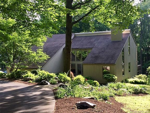 Unique open floor plan contemporary in a beautiful, wooded setting w/ stone walls surrounding grounds of 2.07 acres. Soaring ceilings and lots of glass highlight the open floor plan of this 4 bedroom3.5 bath home. Its large wrap around porch is great for entertaining & BBQs. The kitchen has been completely remodeled with custom cherry cabinets, granite counters and stainless steel appliances and a gas cooktop. The master suite features a walk-in closet and a master bath with double sinks, granite counters and a Jacuzzi tub. There is central air and oil heating and hot water. There is a large (1,400 sq ft)finished walk-out basement with a separate office, full bath, rec room and plenty of storage. This is a conveniently located, but private setting, with easy access to Yale, Merritt Parkway, and an award winning school system. The property abuts the land trust and there is easy access to hiking trails.