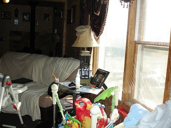 House has some rewiring. On Blacktop. Big kitchen, Short distance to Cloud Nine Ranch, 2 Older barns, Road on 2 sides. Older house/outbuilding has electric. Ventless gas heater, wood stove. House needs work. Crawl space has no access-may be an old cellar under house w/no access. Upstairs bedroom is not finished. No floor covering at entry/stove area. Lender will have to approve any offer for a short sale.