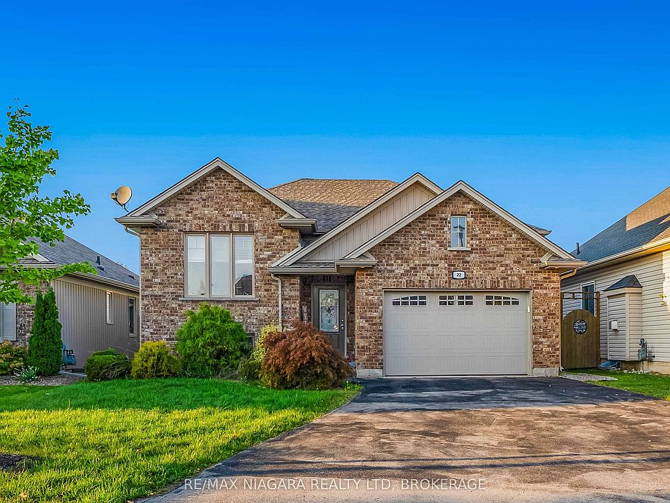 Nestled on a quiet cul-de-sac and just steps to the Welland Canal, this beautifully cared-for raised bungalow offers over 2,000 sq. ft. of finished living space with a versatile layout perfect for families, in-laws, or anyone who loves to entertain.The main floor features gleaming hardwood, soaring ceiling accents, and an open-concept living/dining/kitchen area filled with natural light. The kitchen is equipped with plenty of storage, a large island with breakfast bar, and a garden door walkout to the backyard. Outside you'll find a two-tiered deck, landscaped perimeter, and private pergola, ideal for summer barbecues and quiet evenings alike.The spacious primary bedroom includes a walk-in closet and ensuite privilege, while the second bedroom is generous in size with ample storage. A 4-piece bathroom completes the main level.Downstairs, the bright lower level is loaded with upgrades: a large rec room with electric fireplace and stone feature wall, a third bedroom or ideal office space, a stunning 3-piece bath with glass and tile walk-in shower and modern bamboo-top vanity, plus a full laundry/utility area. The insulated subfloor system provides warmth, comfort, and resistance to moisture and mildew, making this space feel like true above-grade living.Whether you're looking for an in-law setup, space for your okids, or just room to spread out, 22 Henley Court offers the perfect blend of updates, location, and lifestyle.