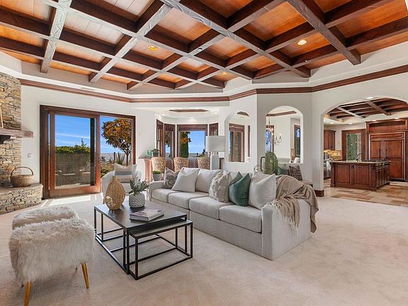 Situated in the exclusive, gate-guarded community of Ocean Ranch this stunning luxury estate offers breathtaking panoramic ocean views. Located at the end of a cul-de-sac, this home is designed with elegance and comfort in mind. On the main level, you'll find a formal living room featuring soaring ceilings, and fireplace with intricate design and gilded accents creating a welcoming atmosphere. Adjacent is the formal dining room complete with fireplace and large glass windows capturing the gorgeous views. As you move through the main level of the home, the chef’s kitchen stands out with granite countertops, a six-burner stovetop, Viking stainless steel appliances, sub-zero refrigerator, dual ovens, walk-in butlers pantry, wood cabinets with pull-out drawers, eat-in bar, and Fisher & Paykel dishwashers. The kitchen opens to the family room, creating the perfect layout for entertaining and time with loved ones. The main floor also includes two spacious bedrooms, each with en-suite bathrooms and walk-in closets. Additionally, there's a powder room for guests, a beautifully crafted office with custom inlaid wood cabinets, ideal for working from home, you will also find the laundry room with extra cabinets and storage. Upstairs, the primary suite serves as a luxurious retreat, with a sitting area, fireplace, and French doors leading to a private balcony offering sweeping ocean vistas. The en-suite bathroom includes a large soaking tub, walk-in shower, heated floors, and a thoughtfully designed walk-in closet. Furthermore there are two additional bedrooms both en-suite, as well as a media/recreation room for movie nights or relaxing. The home also features beautiful wood-beamed ceilings, extensive crown molding, a custom wine room, and whole house water filtration system. The backyard is an entertainer’s paradise, complete with a sparkling saltwater pool, spa, outdoor firepits, a built-in BBQ and bar top-ideal for hosting gatherings while taking in the serene ocean views. Rounding out this exceptional property is a four-car garage finished with epoxy floors and custom cabinets. This estate embodies elegance and comfort in one of Southern California’s most sought-after coastal communities. Enjoy this exquisite home while be close to shopping, dining, top-notch resorts, top rated schools and more.