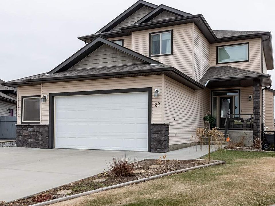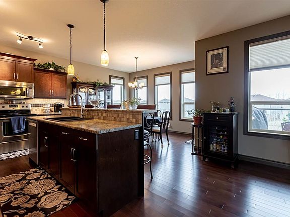 Welcome Home! Beautiful 2 storey walkout on HUGE pie lot, backing onto green space! Grand entry leads to open concept main living area. Kitchen offering a ton of cabinet & counter space, huge island, walk through pantry & stainless appliances! Family sized dining area surrounded by windows & garden door to partially covered deck. Bright living room covered in beautiful dark hardwood, cozy gas fireplace & custom mantle. Full sized enclosed laundry room & 2 pc bath complete the main floor. Upper level has nice sized bonus room, separate from bedrooms 2 & 3. Master suite includes 2 walk-in closets & storage closet, 5 pc ensuite w/ jetted tub, dual sink vanity. 2 additional bedrooms, large linen closet & 4pc main bath. FULLY FINISHED BASEMENT includes 4th bedroom, 4pc bath, nice rec space with bright windows & door to stone/concrete patio entertaining area! OVERSIZED 25'x25', HEATED DOUBLE GARAGE W/ ROOM FOR 2 VEHICLES & TOYS! Central A/C, custom blinds & 2 sheds also included! Quiet family location!
